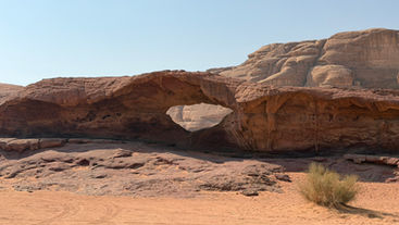 On this half day Jeep tour, we will take you off the tourist trail and deep into the desert to see Wadi Rum’s natural untouched beauty. Climb into our 4x4 Jeep and enjoy stunning panoramic views on the way to our first stop: Chicken Rock. Next, cross from the Red to the White Desert (you will notice how suddenly the sand and rocks change colour) to Isdad it-Tag. This is one of the few places in the desert where you can find water! After exploring we will continue to a magical viewpoint over the vast Um Sabbath. Your expert Bedouin guide will drive you deep into the desert to a place known to very few and almost never visited by tourists, which a massive sandy slope perfect for sand boarding! The tour will continue through beautiful canyons and valleys before driving up a small mountain where you will enjoy one of the best natural views in Wadi Rum. Your guide will help you to take more stunning photos here, then he will take you to Eye Rock also known as Um al-Samn Rock Bridge.